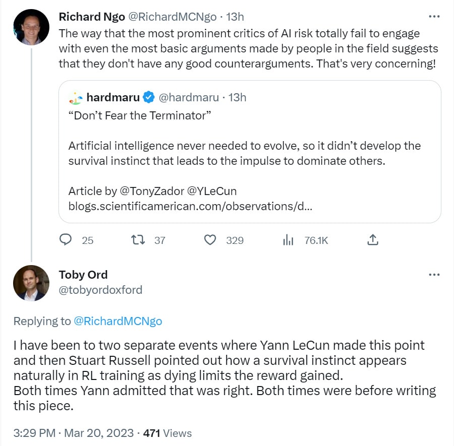 Yann linked to that post on Monday, as did Tyler Cowen,then Yann said “I I think that the magnitude of the AI alignment problem has been ridiculously overblown & our ability to solve it widely underestimated. I’ve been publicly called stupid before, but never as often as by the “AI is a significant existential risk” crowd. That’s OK, I’m used to it.”