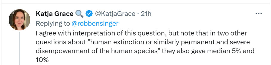 - AI NotKillEveryoneism Expectations: AI researchers put extinction risk at >5%.