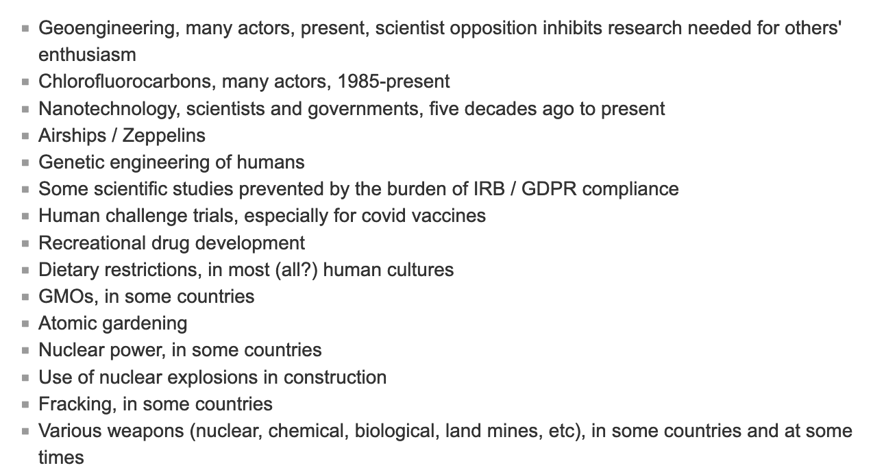 Nanotech: ??? Heavy research into this, I know of zero restrictions. It doesn't work because it's too hard (for humans) to solve