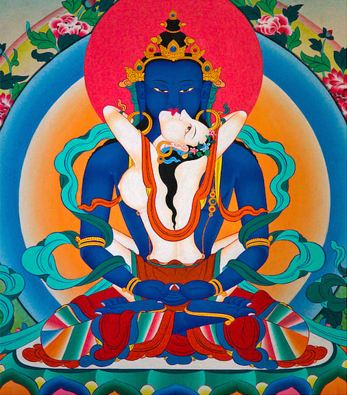 Tantric Buddhist yab-yum thangka painting A common image representing the union of compassionate action (male) with wisdom of emptiness (female), leading to awakening to non-dual truth