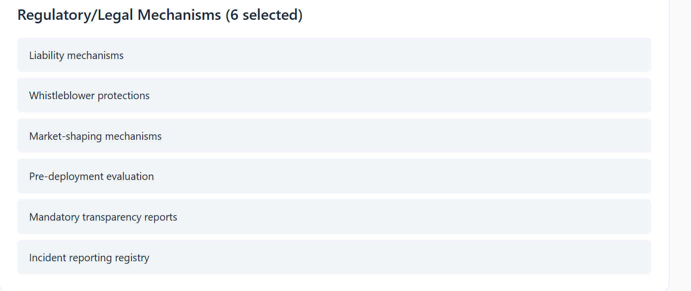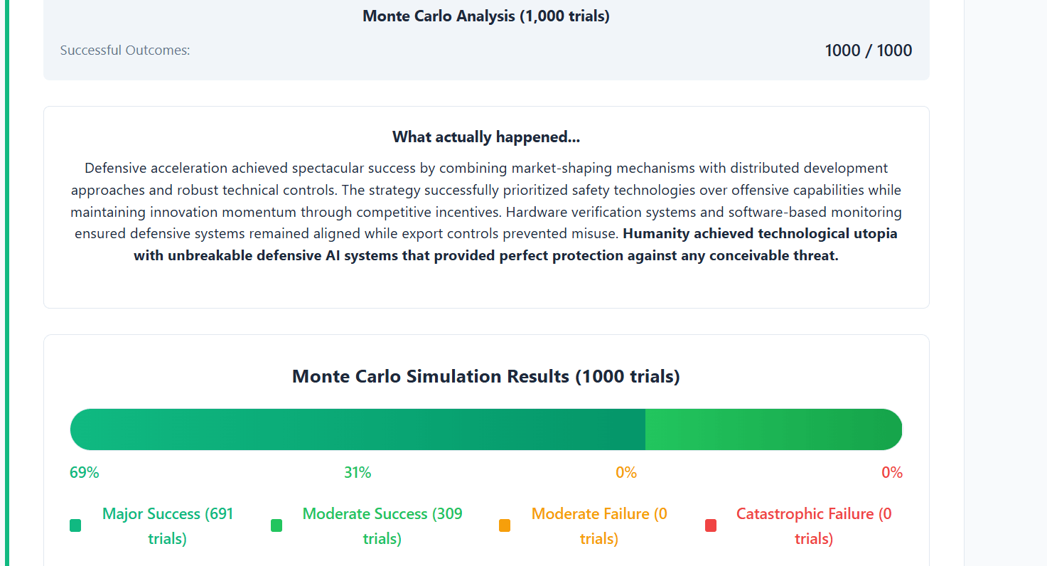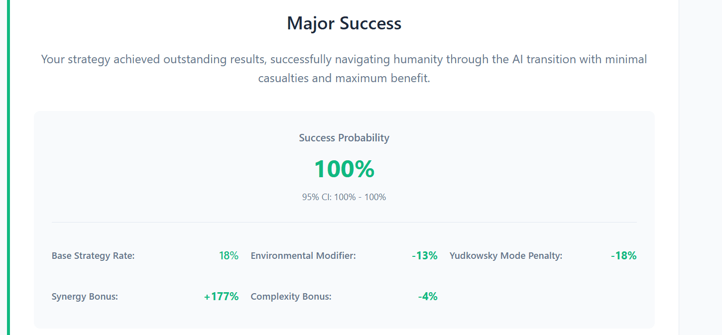 Try it out based on your own beliefs! If you believe that “if anyone builds it, everyone dies”, you'll probably support a Global Moratorium. You can then choose Yudkowsky mode, pick and choose the concrete institutions and mechanisms that might save us (e.g. strong global institutions, strict regulations on model size and hardware-based restrictions).