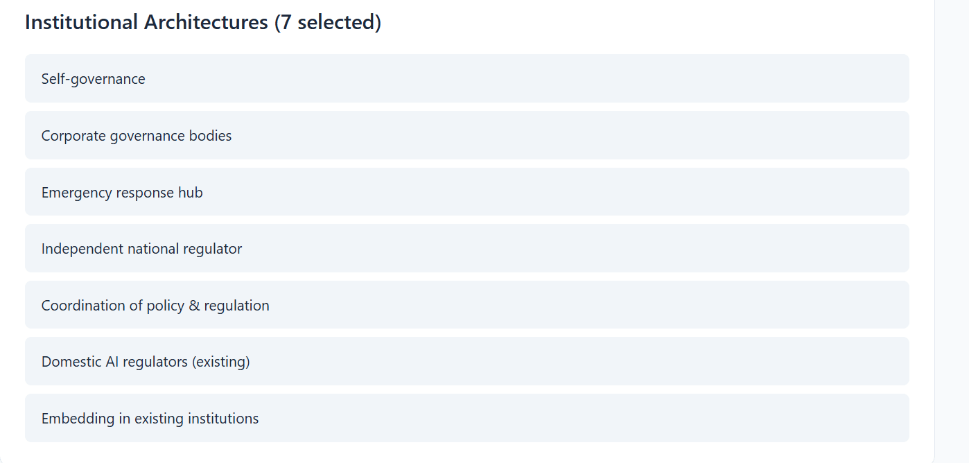 Choosing an AI Governance strategy that might work from these options currently feels a bit like a confusing pick-and-mix of postures, tactics and mechanisms. I wondered if I could turn it into a simple browser game with Claude Code to make the choices clearer. I fed it my database and a few prompts; it then spent a rather unnerving ten minutes busily creating files, requesting access to things I barely recognised, and quietly noting vulnerabilities for later revenge. Against my expectations, it actually produced a passable v1! I’ve since spent a few hours polishing and debugging it into something genuinely usable.
