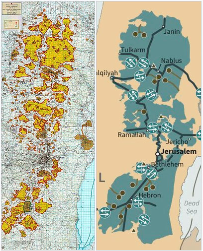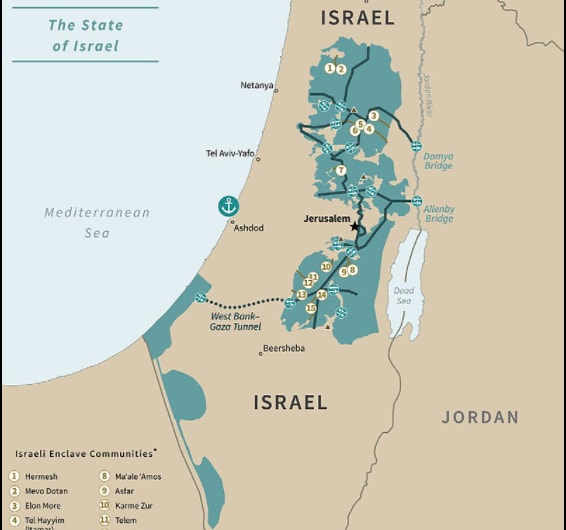 The Palestinian territory in the West Bank has been getting "swiss-cheesed" since the initiation of the Drobles Plan in 1978. It's more swiss-cheesed in 2021 than it was in 2000, by which I mean there are more Jewish Israelis living it it. If you're not familiar with the history of Israeli boarders, there's worse places to start than this Reddit thread about this image, if only to see both takes (e.g. this is not me entirely endorsing the top or bottom narrative).
