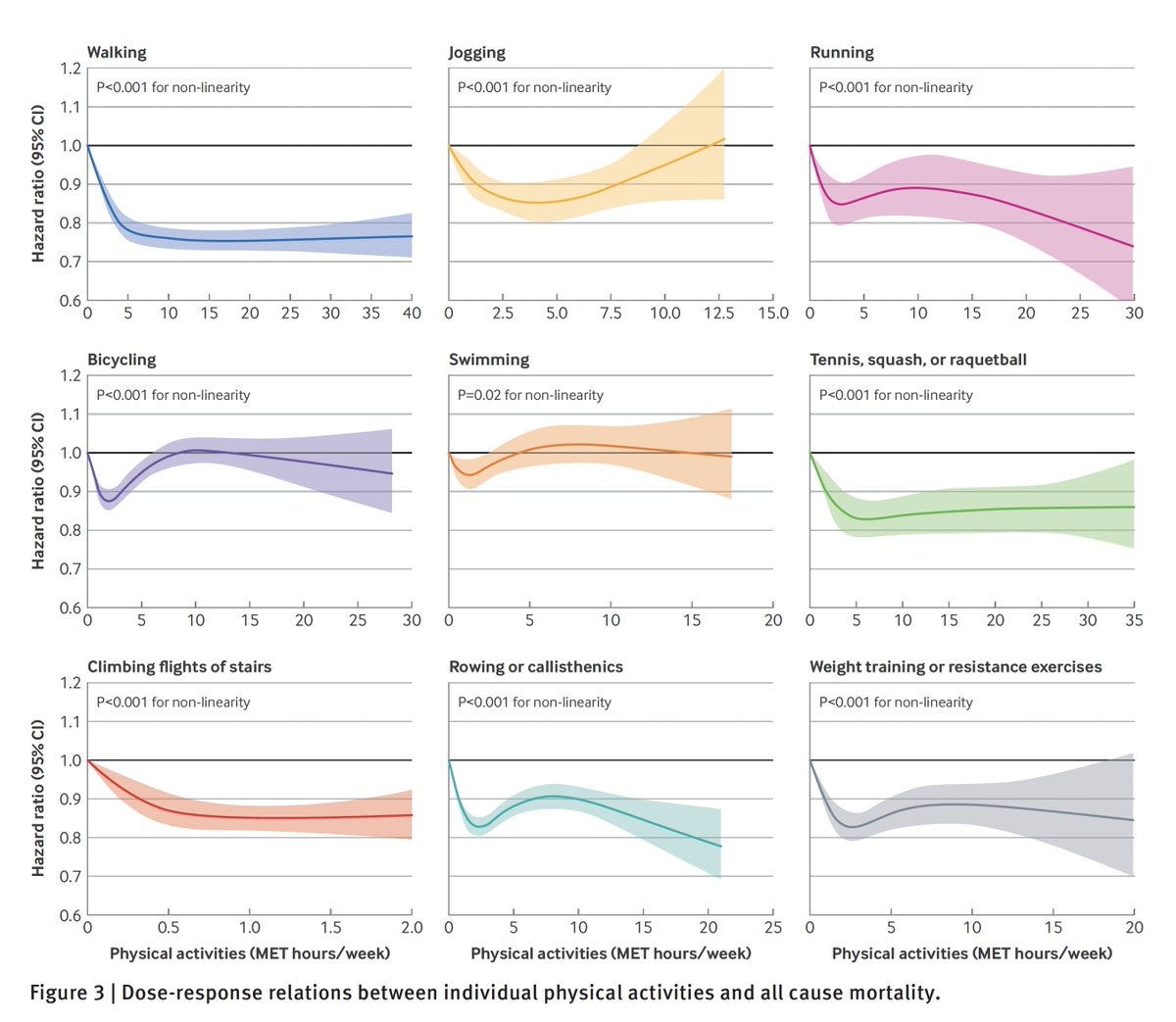 A new large observational study claims that 45 minutes a day of walking gives you most of the all-cause mortality benefits of exercise, and running doesn’t do better than walking until you do rather a lot of it, whereas too much jogging can actively backfire and swimming and bicycling do little. Doing multiple types of activity was better.