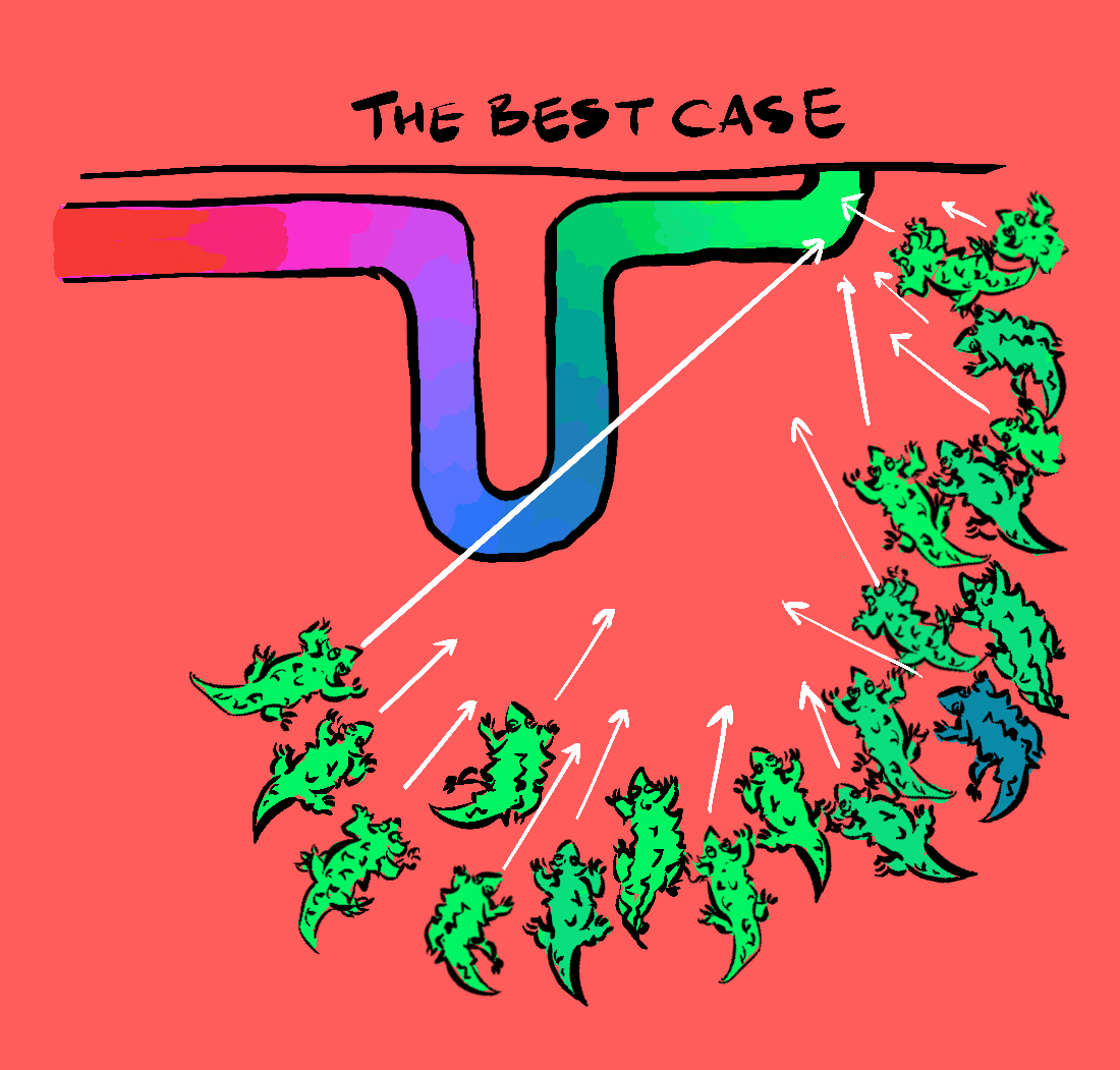 Perhaps you have found yourself at the Moloch Inter-Dimensional Spaceport baggage claim and observed one or two lizard brains start to crowd the conveyor, and suddenly half the passengers are scrambling for a space while the rest of you throw up your claws in despair. Moloch’s victims are just trying to get their bag as quickly as possible, but the result is that it takes longer for everyone. However, it’s not always the case.