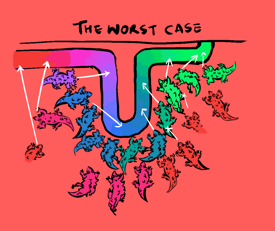 Those in front still have to wait for their bag to come to their spot on the conveyor, while those behind have to wait 'til their bag reaches the very end of the conveyor where they might have a chance to push past and retrieve their bag before it vanishes back into the mouth of the beast, some can’t see anything, and those at the front, having retrieved their bags, are trapped by the horde behind them.