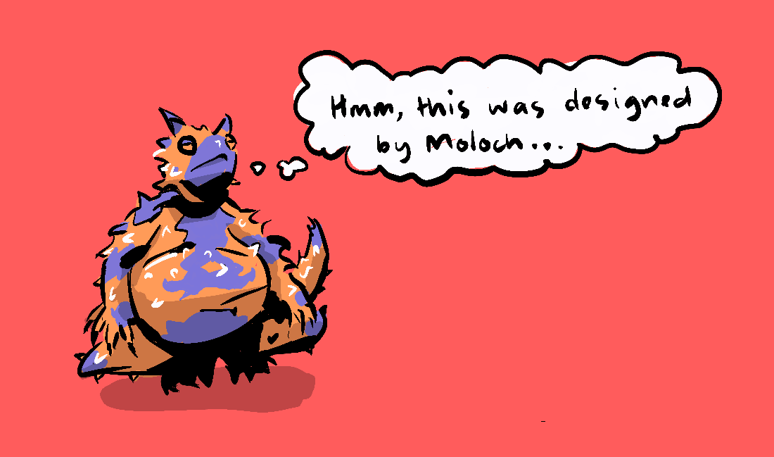 Moloch is conceived as a tyrannical god that demands child sacrifice, threatening far worse if his hunger is not satisfied. In game theoretical terms, the negative payoff of losing his support, or worse courting his ire, makes yielding to the tyrant’s demands the optimal strategy, but in doing so the victims keep the monster alive, so they can never escape this perpetual negative-sum game.