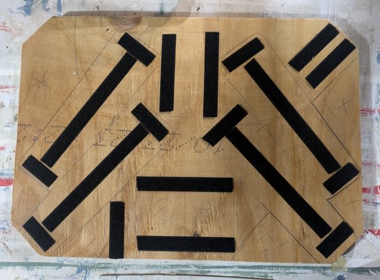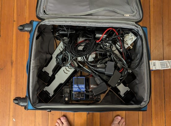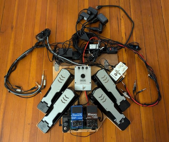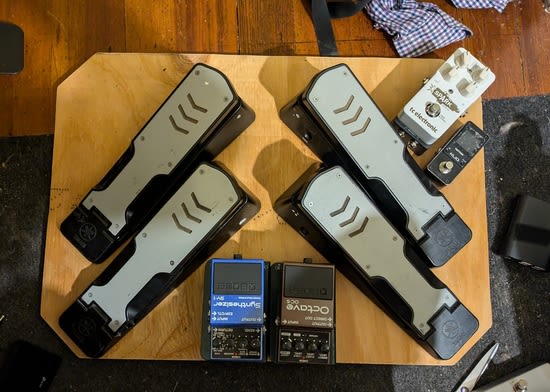 I started by cutting a piece of 3/4" plywood to the largest size I could fit in the suitcase I usually travel with. Then I played around with pedal layouts: