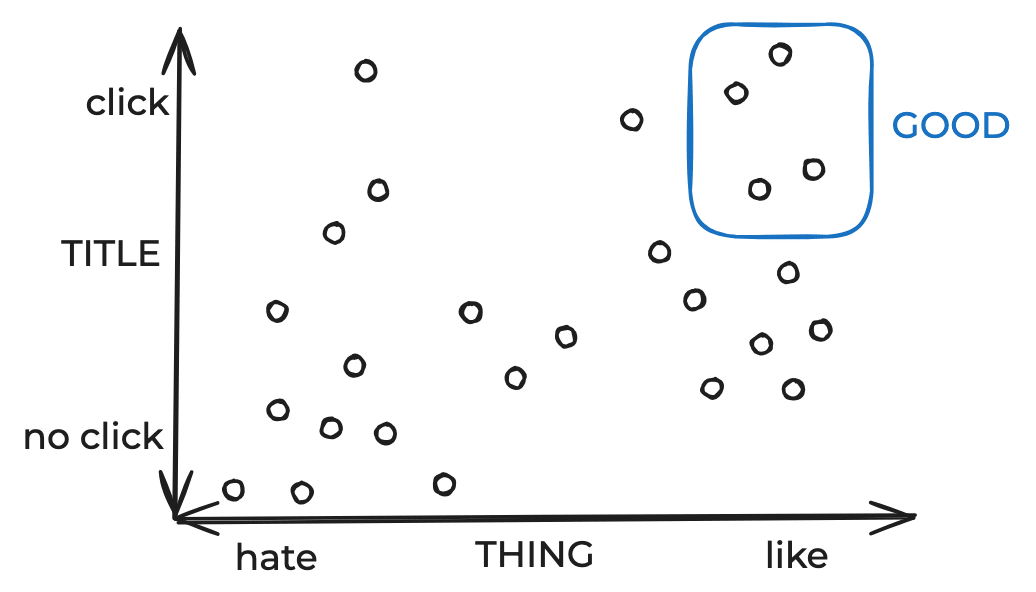 A title has two goals. First, think of all the people in the world who, if they clicked on your thing, would finish it and love it. Ideally, those people would click. That is, you want there to be people in the like + click region: