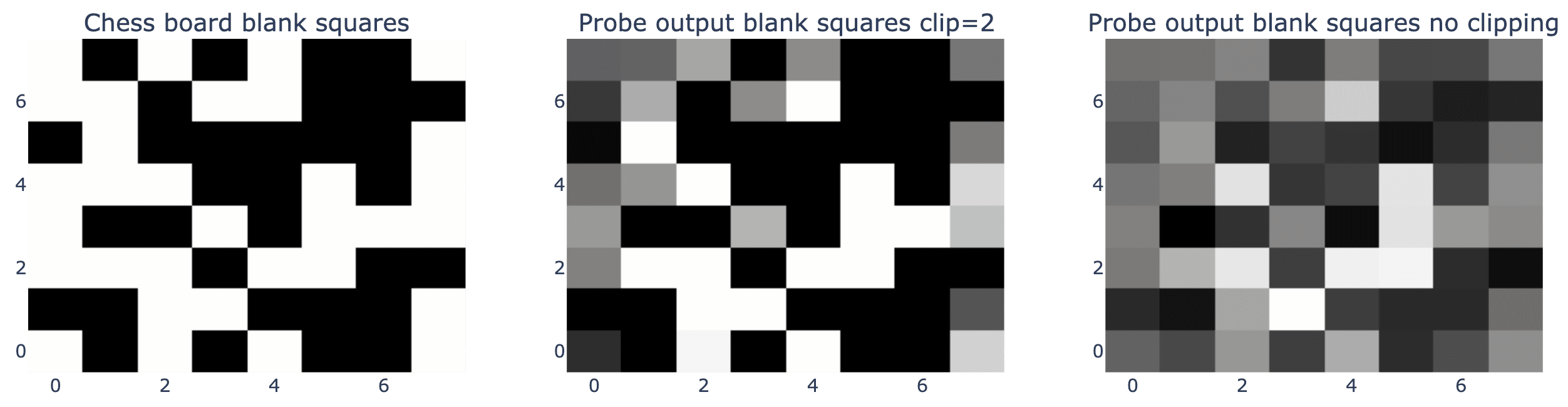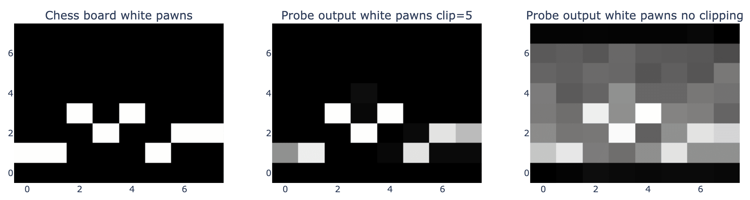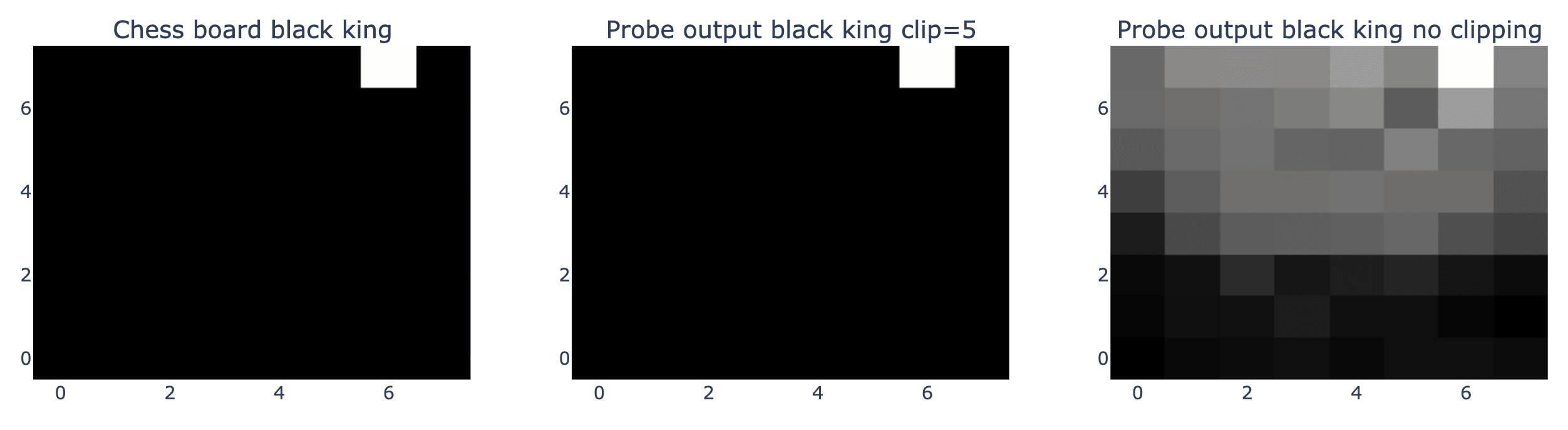To better interpret the internal predictions of my model, I created some visual heat maps. These heat maps were derived from the probe outputs, which had been trained on a one-hot objective to predict whether a chess piece, such the black king, was present on a given square (1 if present, 0 if not). The first heat map shows the actual board state for the black king. The second heat map depicts the probe’s confidence with a clipping limit applied to the output values where any value above 5 is reduced to 5. This clipping makes the probe's output more binary, as shown by the white square against the black background. The third heat map presents the probe’s output without any clipping, revealing a gradient of confidence levels. It shows that the model is extremely certain that the black king is not located on the white side of the chessboard.