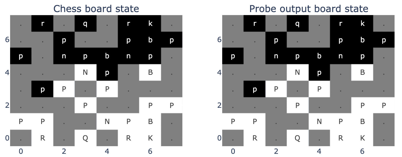 For this move in this chess game, the linear probe perfectly reconstructs the state of the board. The probe's objective is to classify each square into one of 13 categories, each representing a different chess piece or a blank square. To create this graph, we just take the prediction with the highest value for each square as the probe's output.