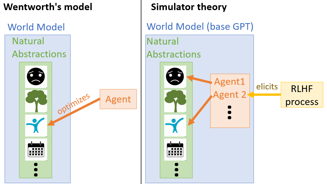 Janus has argued that the correct way to think about models like GPT is not as agents trying to achieve some goal, but as simulators, that simulate the processes that have generated the text in their training data. We now have a somewhat agent-like conversation partner in ChatGPT by eliciting the simulation of a helpful, friendly servant. This might seem similar to Wentworth's original idea of an agent on top of a pre-trained world model, but there is an important difference: Most of the cognition occurs within the world model.
