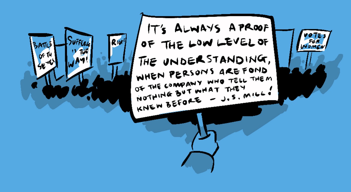 Mill’s insight was that for men to be strong doesn’t mean women have to be weak. In fact, J.S Mill proposed that the inclination to limit women’s education resulted from a weakness in men—a fear of being challenged. The fact is, strength begets strength, stronger men and women urge each other on to reach their potential.