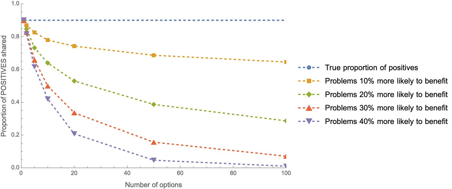 We can simulate what happens. We’ll vary both how much more likely (on average) problems are to yield benefits than positives (different-colored lines), and also vary how many topics (number of options, x-axis) each person has to choose from. Here’s what we get: