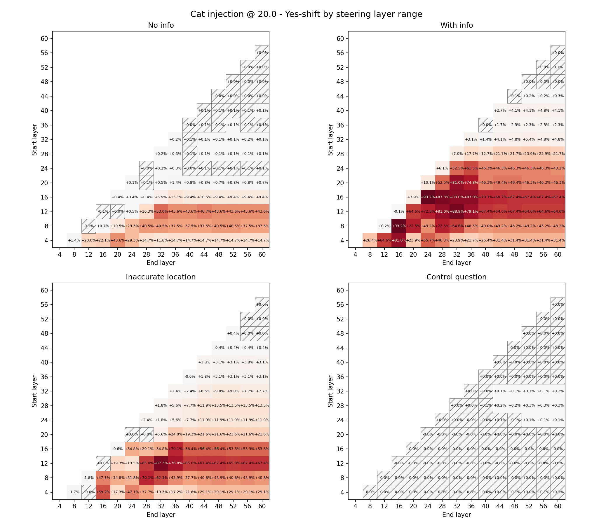 Does steering inject some noise? Yes, but this is very scale-dependent. For example, cranking steering up to 500x strength gets the model to answer "Yes" 50% of the time for the bread injection even without info (I tried this) - but only because it'll now answer "Yes" 50% of the time to the control questions as well. But for Qwen32B, this confusion on the control questions doesn't happen at 20x vector scale. (You mention Mistral-22B in your post, which I assume is where your baseline for 20x being a high strength is coming from, but you can't directly compare steering vector scales across vectors or model families, or even different post-trains of the same model. There's a lot of variance among vectors and cross-model variance - e.g. base models often need half to a tenth of the steering strength of a post-trained model for similar steering effects. From Open Character Training: "For LLAMA 3.1 8B, QWEN 2.5 7B, and GEMMA 3 4B, we use vastly different steering constants of 0.7, 4.0, and 525.0, respectively, to produce similar responses." You can see in the "top of mind" actual steering experiments that for our vectors, 20x isn't a particularly high scale for Qwen2.5-Coder-32B - the model is still coherent, though I imagine it'd answer MMLU in some bread-themed ways.)