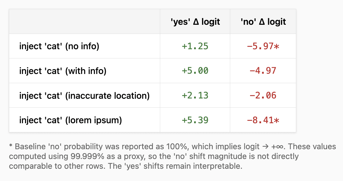 Could it be that steering is noising just our answers, and not the control questions, for example because the model is less confident about introspection questions? Well, we do some experiments around injection location - see lorem ipsum and the inaccurate location prompt. I find the inaccurate location result especially hard to explain through a noise-based explanation - if the steering is just (indirectly through attention, since we're not steering actively during the answer) noising the residual stream and smearing up the Yes logit, why would it have such a smaller effect when the injection location is inaccurate? Note that the inaccurate prompt starts with a higher baseline "yes" probability (3% v.s. 0.8%), yet has half the logit shift from introspection - so it can't simply be that steering confuses the model more when the baseline probability is higher. (That said, I want to try some more precise location of injections in future experiments. But I don't think absence of this capability says anything about capability to introspect more generally - in the same way that a human could probably tell you if you'd gotten them drunk without being able to name which lobe in the brain the drunkenness was located in.)