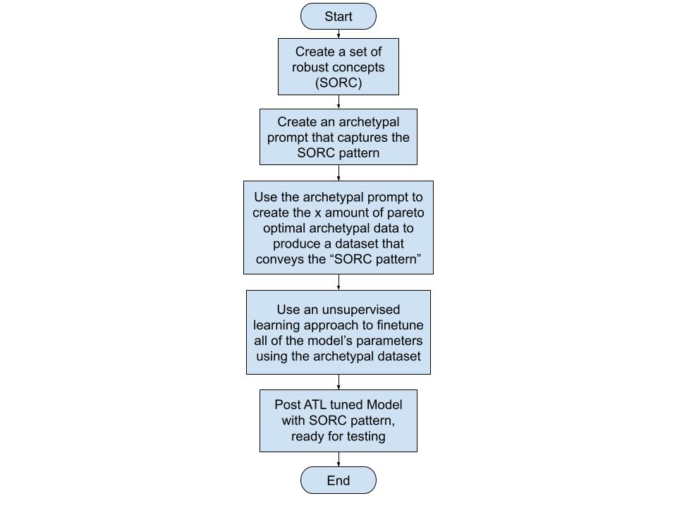 By capturing our values, ones that are mostly agreed upon and currently grounded as robust concepts[3] encoded in an archetypal prompt[4][5], carefully distributed in an archetypal dataset and mimic the pattern of Set of Robust Concepts (SORC) we can take a significant stride towards alignment. 'Robust concepts’ refer to the concepts that have allowed humans to thrive as a species. Selecting these 'robust concepts’ based on their alignment with disciplines that enable human flourishing.' How ATL is trying to tackle this challenge minimizing human bias close to zero is shown in the diagram below: