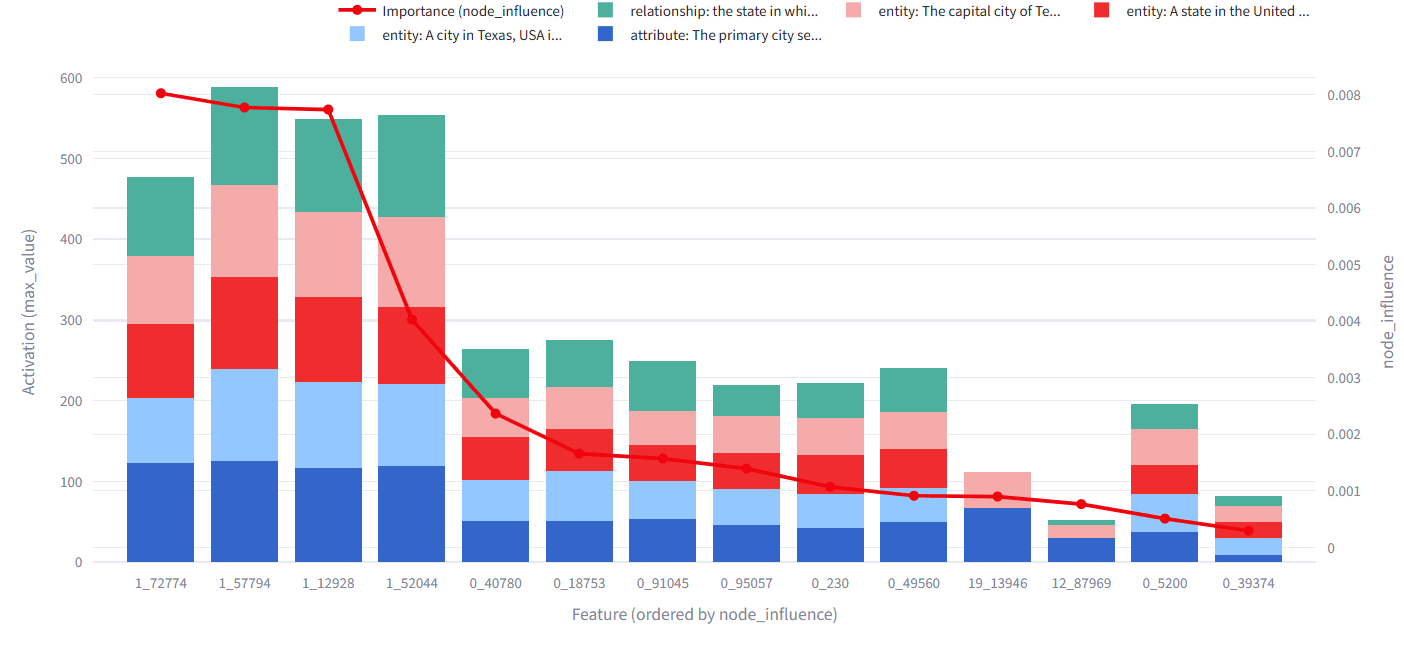 The largest of these groups, "(Texas) related" (2 features), demonstrates the polysemantic nature of Relationship nodes. Feature 1_12928 provides a clear example: rather than peaking consistently on "Texas" like the Semantic Texas features, it peaks on structural prompt tokens—"entity", "attribute", "relationship"—that provide no direct semantic information. However, when we examine its activation profile across the extended semantic vocabulary (aggregating responses to all probe concepts), a clear pattern emerges: Texas receives the highest activation (100.97), followed by Dallas (91.24), state (90.70), and capital (74.52). This feature doesn't detect the token "Texas" itself but rather activates diffusely on Texas-related semantic content appearing in relational contexts.