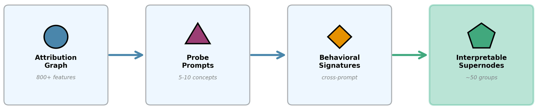 Summary: Attribution graphs reveal which features contribute to model outputs, but interpreting these features remains bottlenecked by manual analysis. I present an automated probe-prompting pipeline that extracts concept-aligned supernodes with minimal supervision. Features are measured against targeted, concept-varying prompts, grouped by behavioral signatures, and validated with Neuronpedia’s Replacement and Completeness metrics. On two classic “capitals” circuits, subgraphs average 0.53 Replacement and 0.83 Completeness, outperforming geometric clustering on interpretability metrics; entity-swap tests suggest an early-layer/late-layer split in what generalizes.