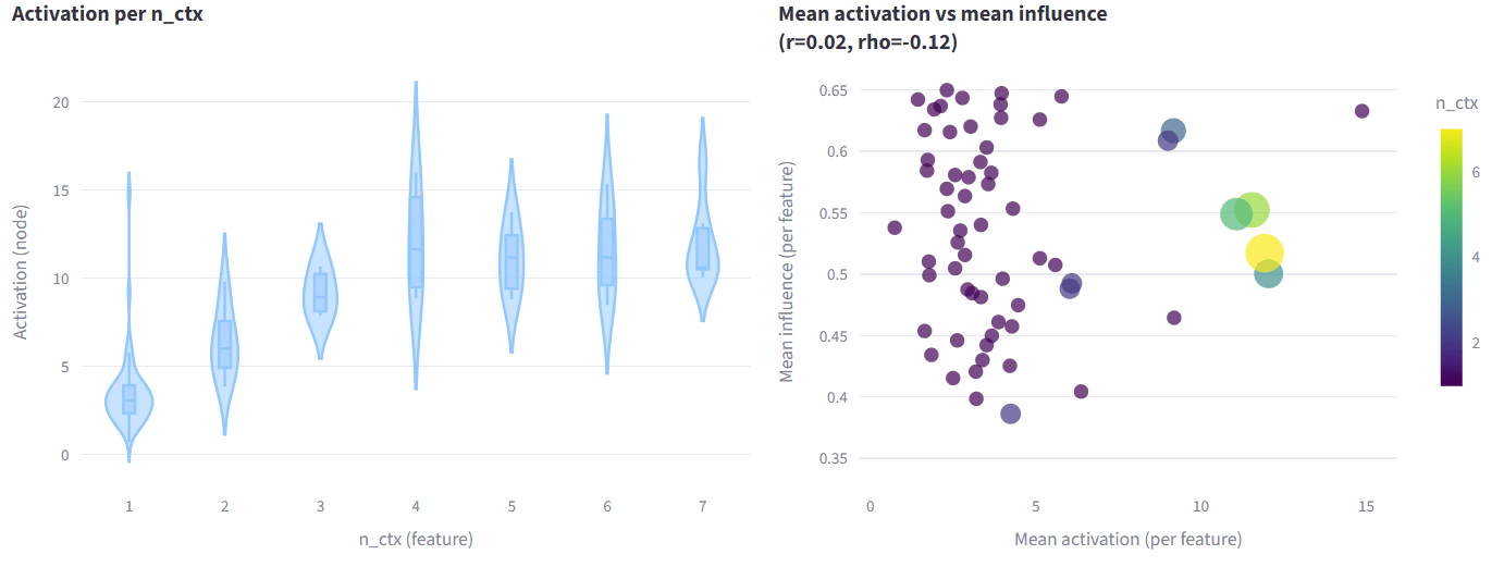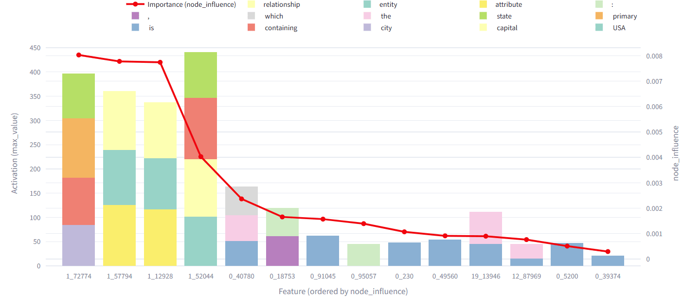 | Nodes | [{node_id, layer, feature, ctx_idx, activation, influence}] | Features (4,000-6,000 after pruning) with layer position, activation strength over each token, and influence score |