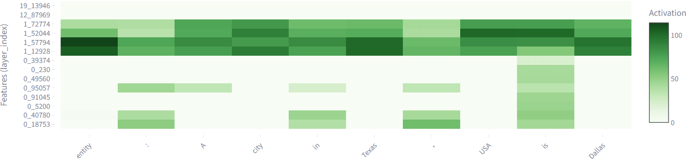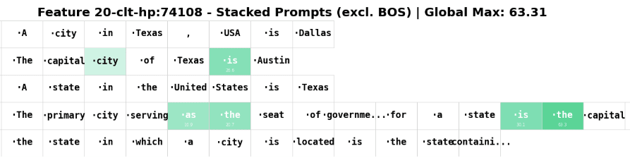 0_40780 peaking on " is" → target: " Dallas" (forward distance 1)7_66152 peaking on " is" → target: " Austin" (forward distance 1)This preprocessing enabled interpretable naming: instead of generic “functional token detector,” features received specific labels like “Say (Austin)” based on their target context.