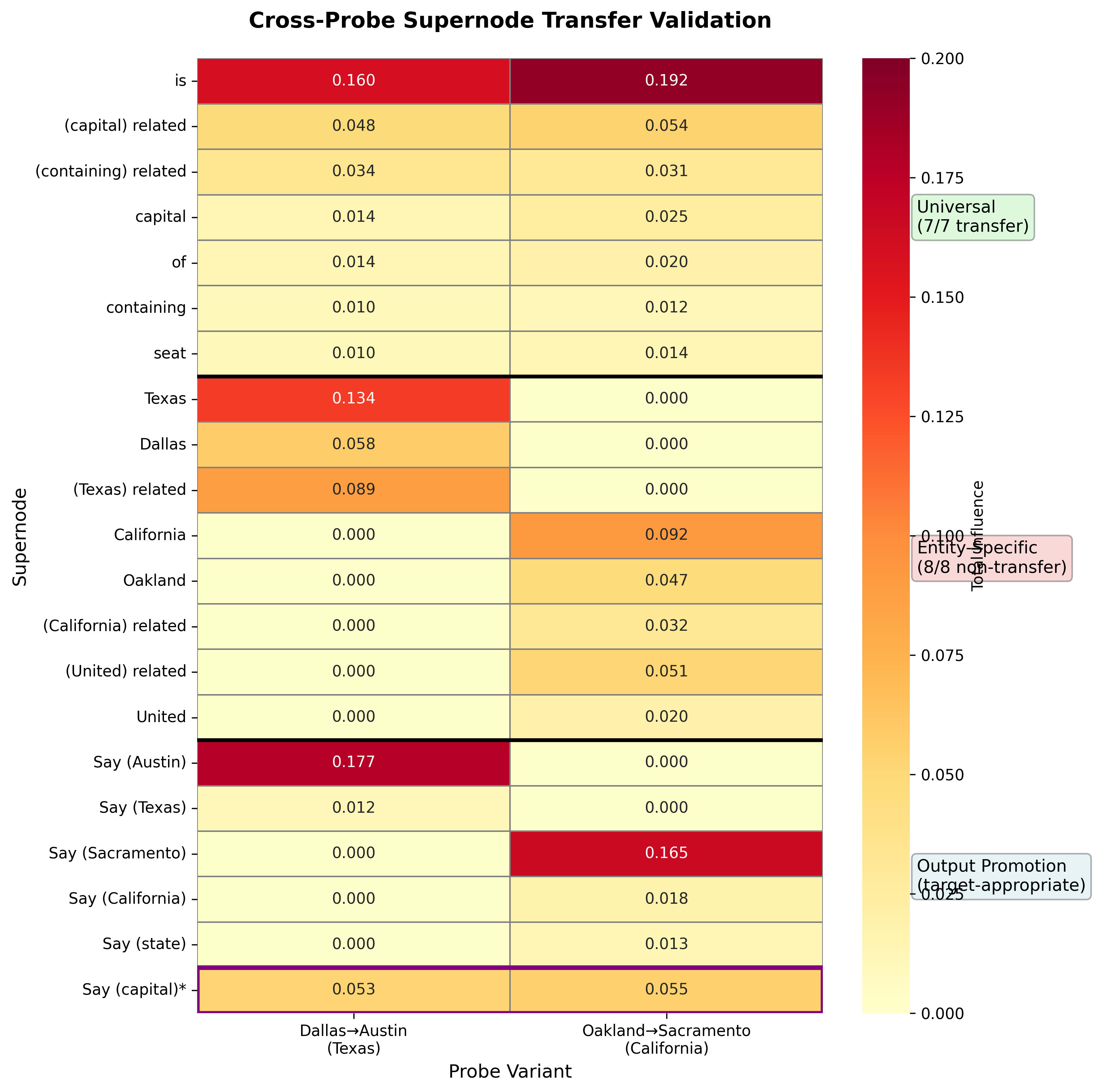 To assess whether discovered supernodes represent stable computational structures versus probe-specific overfitting, we tested the pipeline on a structurally identical probe with substituted entities: Oakland → Sacramento (California capital) compared to the original Dallas → Austin (Texas capital). Both probes require the same multi-hop reasoning (identify city → retrieve state → recall capital) but differ in all factual content, enabling direct evaluation of which circuit components generalize.