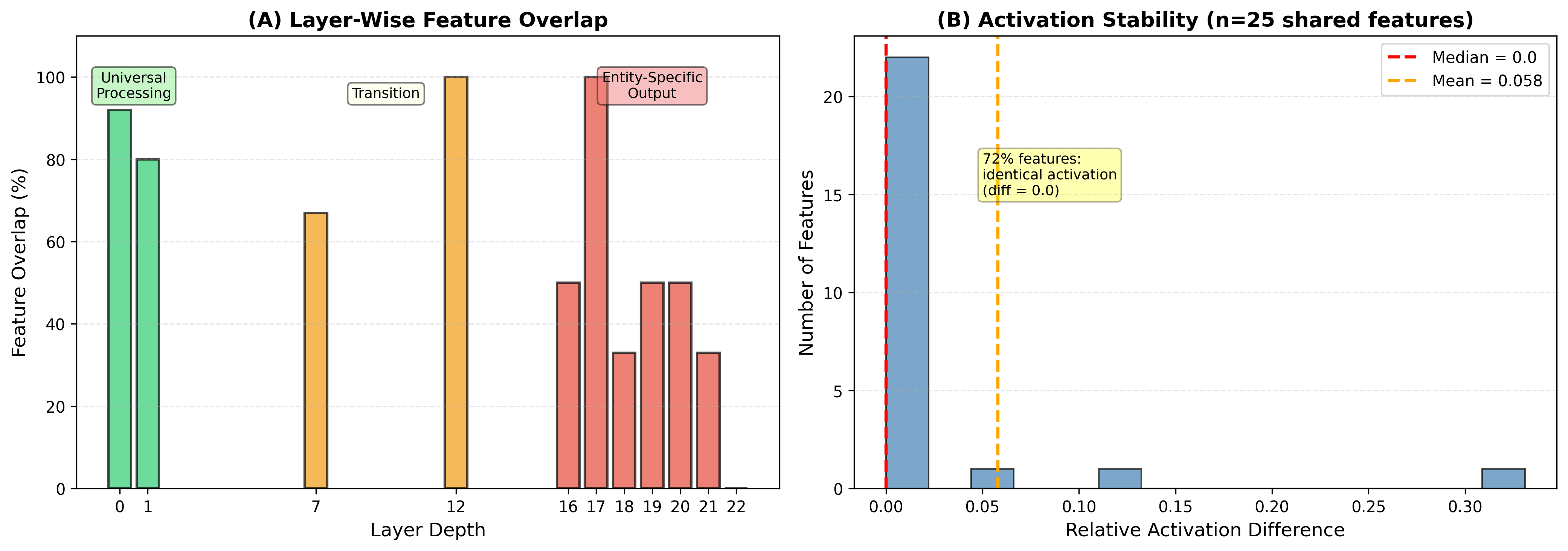 Layer-wise analysis confirmed hierarchical organization: early layers (0-1) showed 80-92% feature overlap (universal operations), declining to 0-50% in late layers (16-22, entity-specific output promotion). This gradient held constant across probes, indicating the model maintains stable architectural layering while substituting factual content.