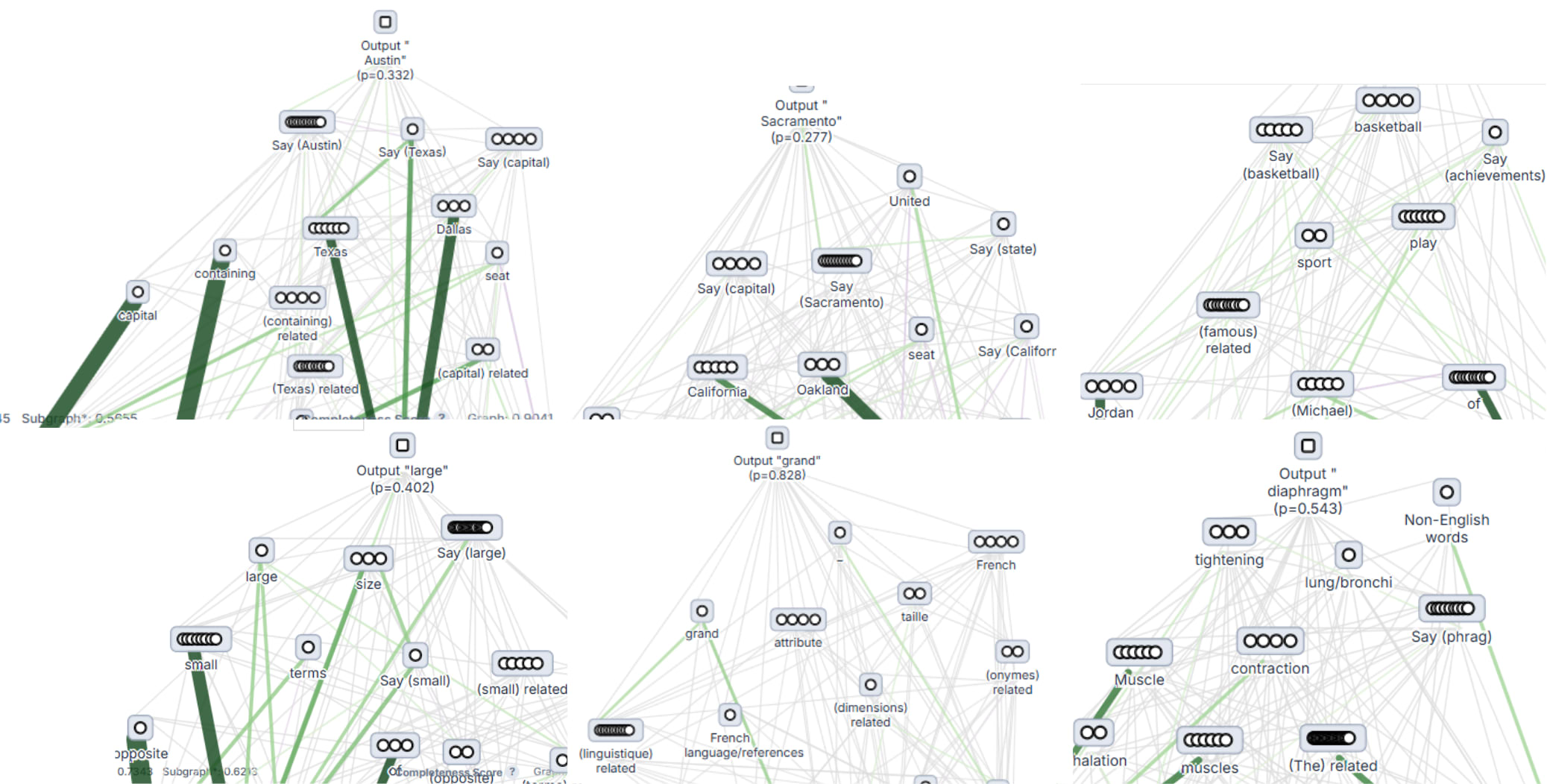 In practice, the current workflow demands a lot of manual interpretation. Human analysis involves starting from the final logit, identifying the most influential nodes, and inspecting their strongest activations over the training corpus to infer their semantic role. This approach is partially supported by autointerp methods such as those available on the Neuronpedia platform. Given the large number of nodes involved, users must manually select and group the most interpretable ones into supernodes. The resulting subgraph offers a more tractable, high-level view of the causal path from embeddings to the final logit. Current workflow require researchers to: