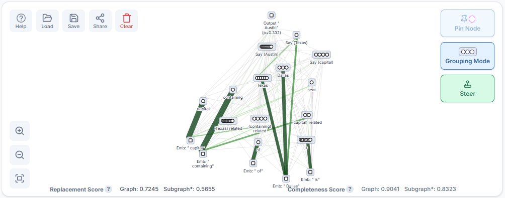 Completeness Score: Measures the fraction of incoming edges to all nodes (weighted by influence on output) that originate from feature/token nodes rather than error nodes. This gives partial credit for nodes that are mostly explained by features, even if some error influence remains. Again, unpinned features are treated as error nodes for subgraph scoring.