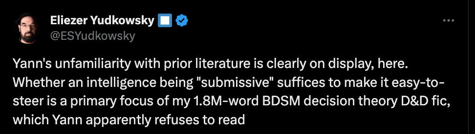 I think an important part of planecrash isn’t in its lectures but in It’s story and the experiences of its characters. While Yudkowsky jokes about LeCun refusing to read it, it is actually arguably one of the most comprehensive ways to learn about decision theory, with many of the lessons taught through experiences of characters and not through lectures.