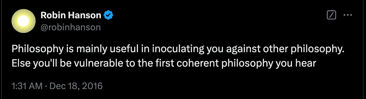 Why is Yudkowsky so compelling? There are intellectuals like Scott Alexander who are most-strongly identified by a particular method (an even-handed, epistemically-rigorous, steelmaning-focused treatment of a topic), or intellectuals like Robin Hanson who are most-strongly identified by a particular style (eclectic irreverence about incentive mechanisms). But Yudkowsky's hallmark is delivering an entire system of the world that covers everything from logic to what correct epistemology looks like to the maths behind rational decision-making and coordination, and comes complete with identifying the biggest threat (misaligned AI) and the structure of utopia (dath ilan). None of the major technical inventions (except some in decision theory) are original to Yudkowsky. But he's picked up the pieces, slotted them into a big coherent structure, and presented it in great depth. And Yudkowsky's system claims to come with proofs for many key bits, in the literal mathematical sense. No, you can't crack open a textbook and see everything laid out, step-by-step. But the implicit claim is: read this long essay on coherence theorems, these papers on decision theory, this 20,000-word dialogue, these sequences on LessWrong, and ideally a few fanfics too, and then you'll get it.