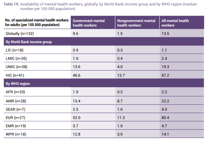 Using the latest WHO Mental Health Report data, we identified severe disparities in mental health workforce availability: