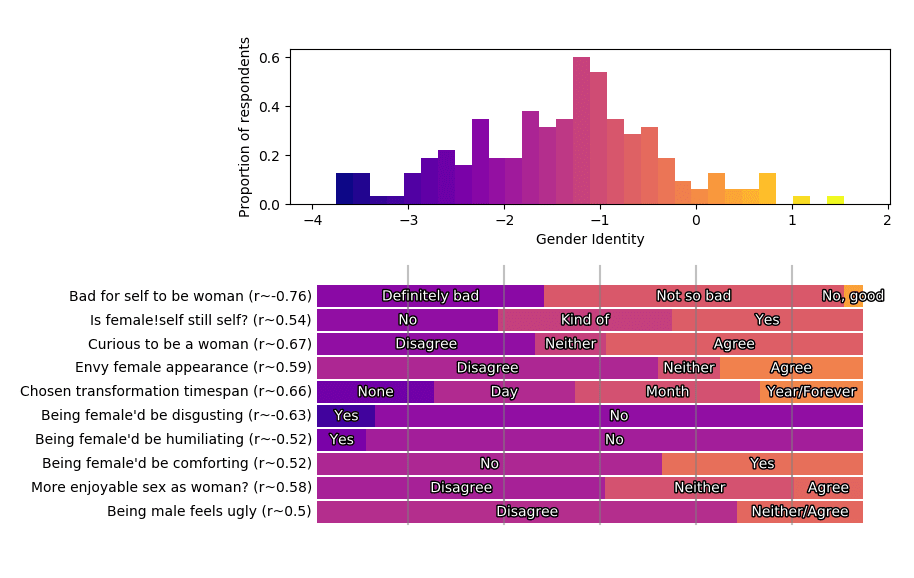 We can also plot this against the gender identity scores. It turns out that autogynephilia is pretty much the strongest nontrivial psychological correlate of gender identity: