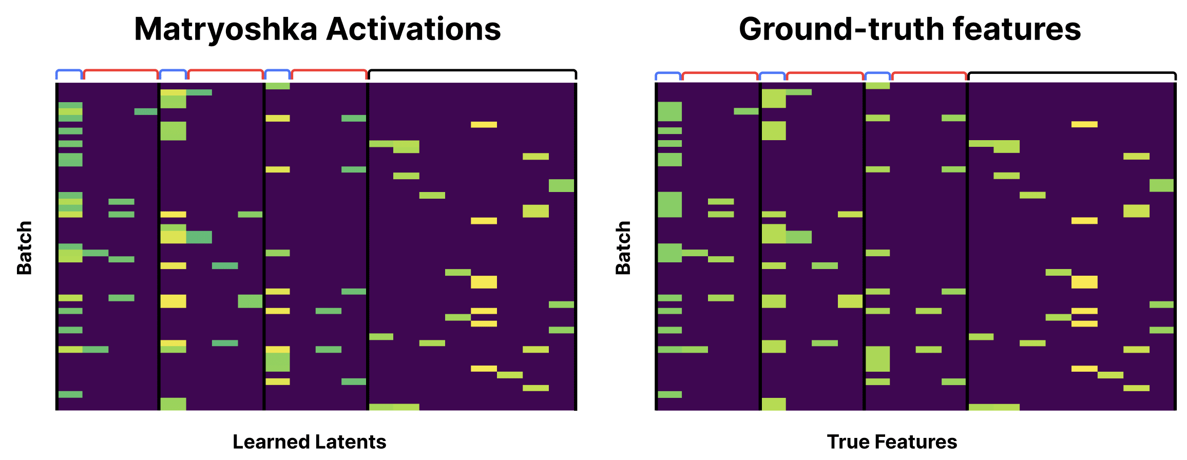 To address these limitations, I introduce Matryoshka SAEs, an alternative training approach inspired by prior work[4:1][5:1]. In a toy model designed to exhibit feature absorption, Matryoshka SAEs completely avoid the feature-absorption holes that appear in vanilla SAEs.