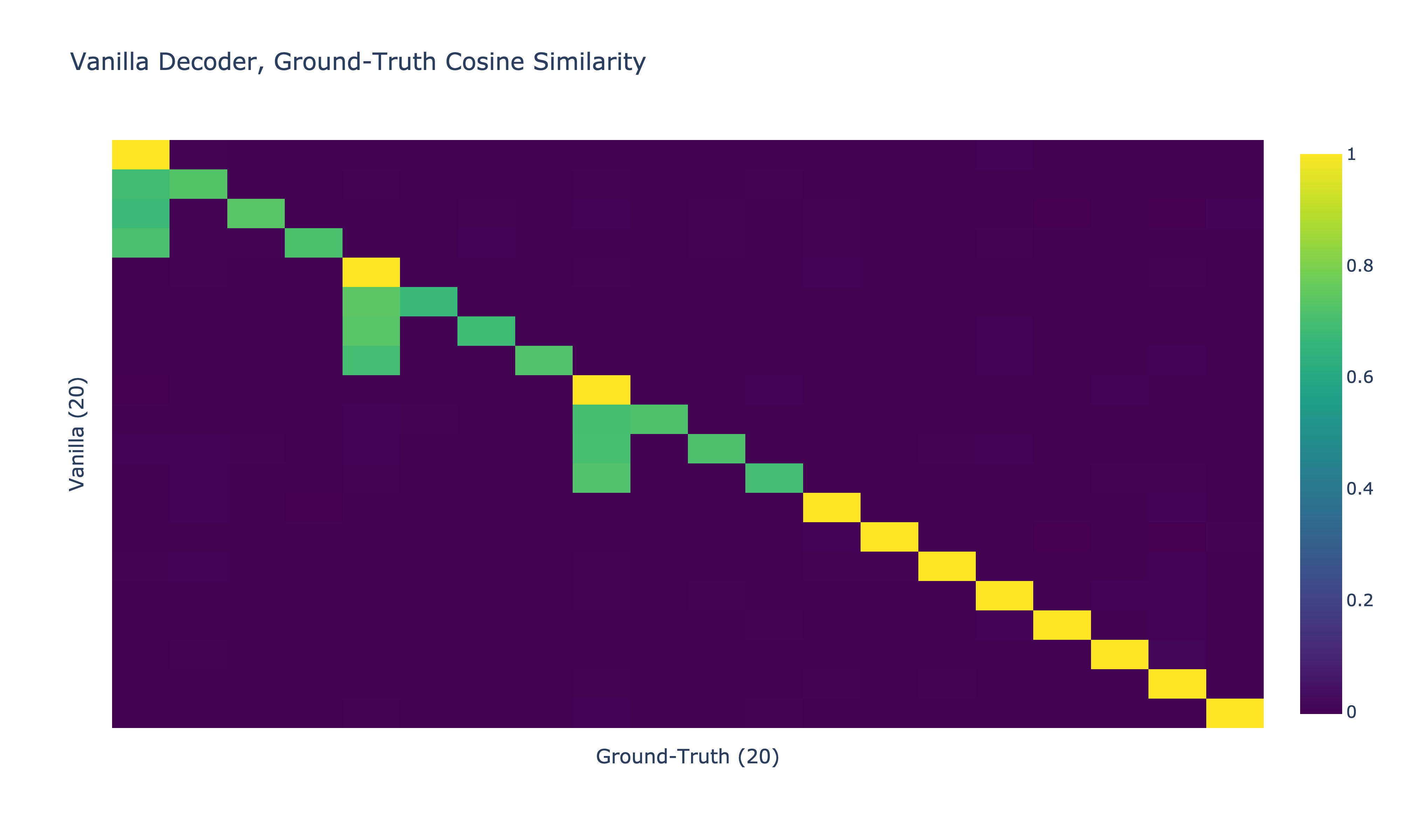 Here are the cosine similarities between the ground truth features and the vanilla and Matryoshka SAE decoders.