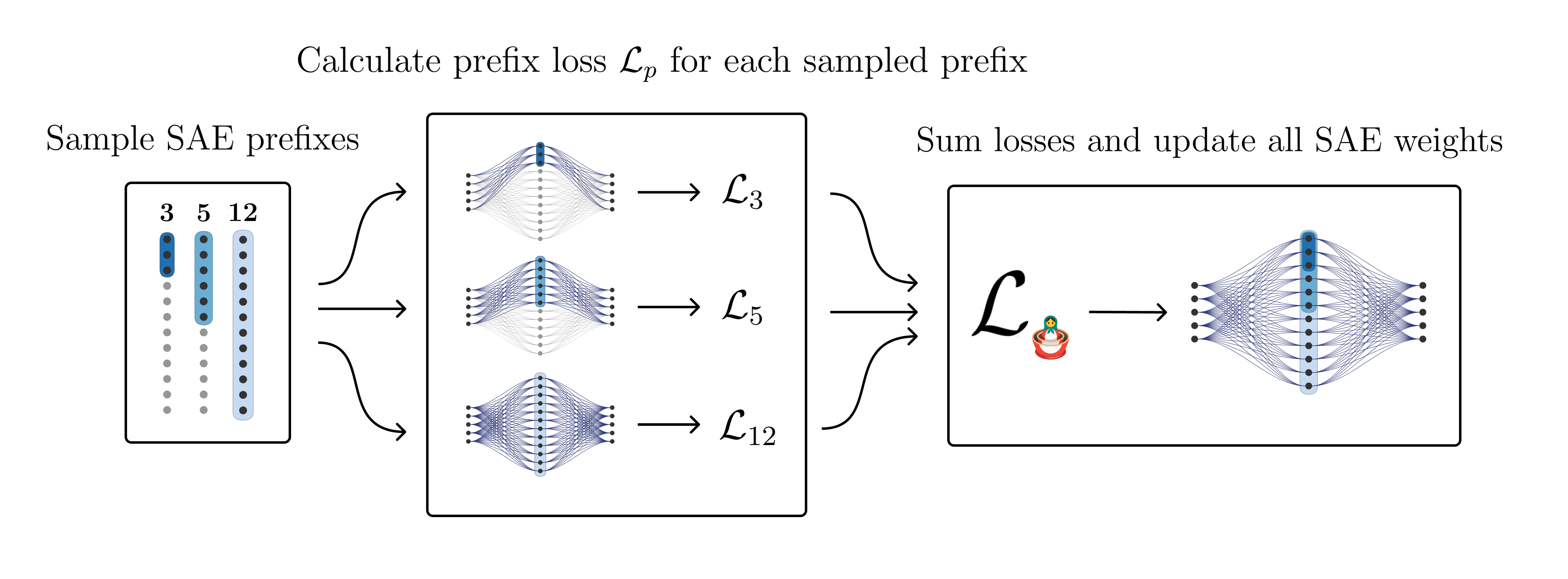 The Matryoshka SAE computes multiple SAE losses in each training step, each using a different-length prefix of the autoencoder latents. When computing losses with shorter prefixes, early latents must reconstruct the input without help from later latents. This reduces feature absorption - an early "female words" latent can't rely on a later "Lily-specific" latent to handle Lily tokens, since that later latent isn't always available. Later latents are then free to specialize without creating holes in earlier, more abstract features.