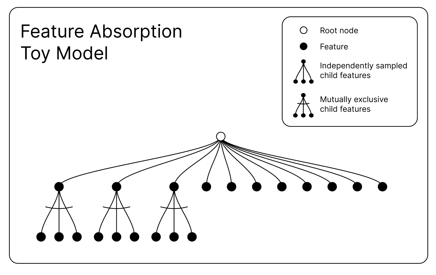 I tried to investigate this using a simpler version of the setup in this post, focusing on a single parent/child relationship between latents. This is like a zoomed-in version on a single set of parent/child features. Our setup has 3 true features in a hierarchy as below:
