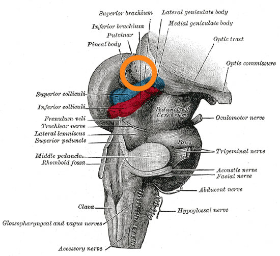 the superior colliculus (another brainstem region and the “first stop” in the brain for visual signals from the retina)