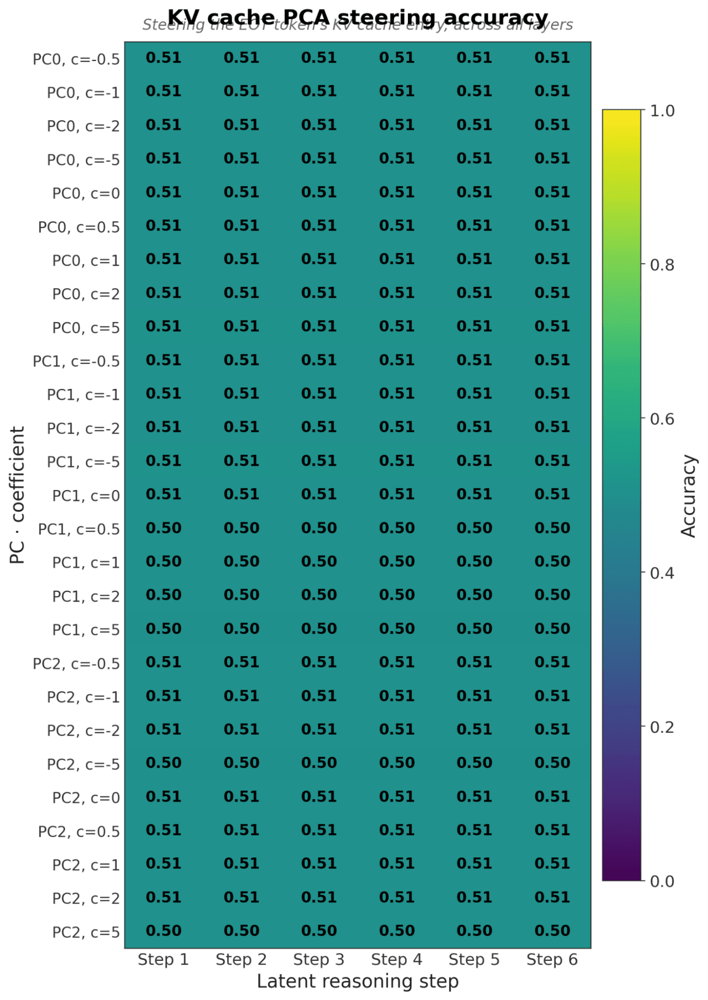 Activation Steering with hidden state requires a forward pass due to the fact CoDI only keeps the kv values. So to make a fair comparison of PCA steering I ran kv steering through a forward pass and found KV steering matched a random vector after forward pass.