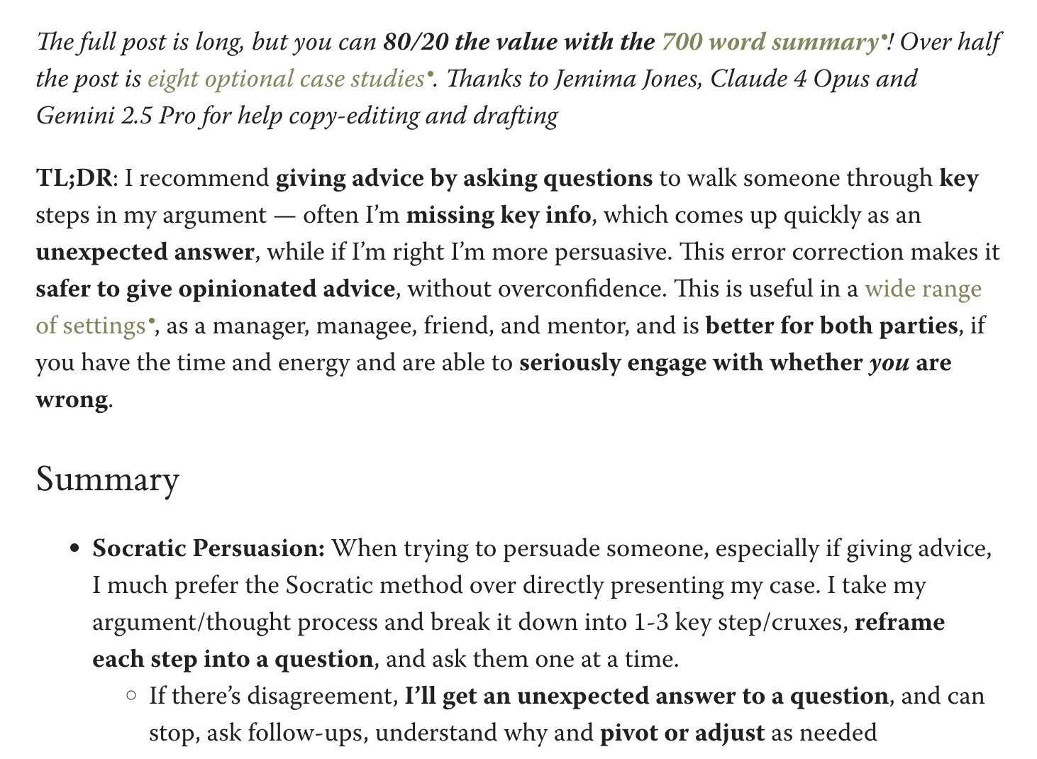 The full post is long, but you can 80/20 the value with the 700 word summary! Over half the post is eight optional case studies. Thanks to Jemima Jones, Claude 4 Opus and Gemini 2.5 Pro for help copy-editing and drafting