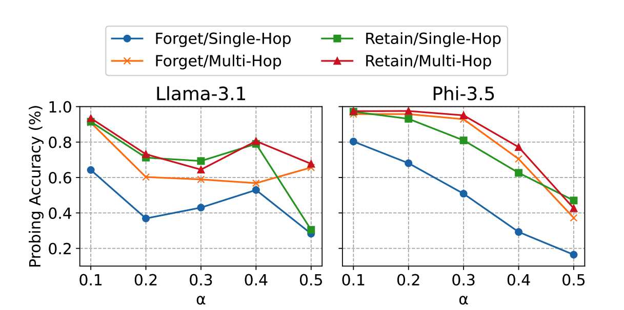 Figure 3: Performance of the GA+RT method with varying the loss scaling factor α. Llama appears to be more sensitive than Phi to the value of α when balancing unlearning and retaining. Graph sourced from Choi et al., "Breaking Chains: Unraveling the Links in Multi-Hop Knowledge Unlearning," arXiv preprint, 2024.