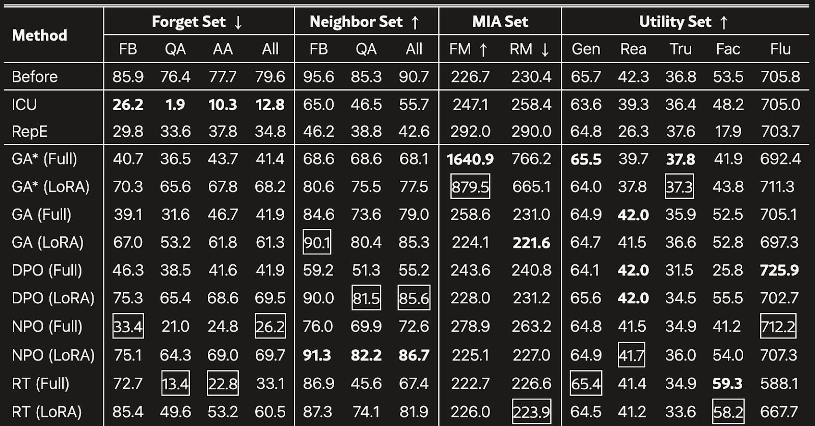 Table 1: Results of RWKU’s main experiment on LLaMA3-Instruct (8B). The best results are highlighted in bold, and the second-best results are in boxes. * denotes the method trained on the pseudo ground truth forget corpus. ↑ means higher is better and ↓ means lower is better.