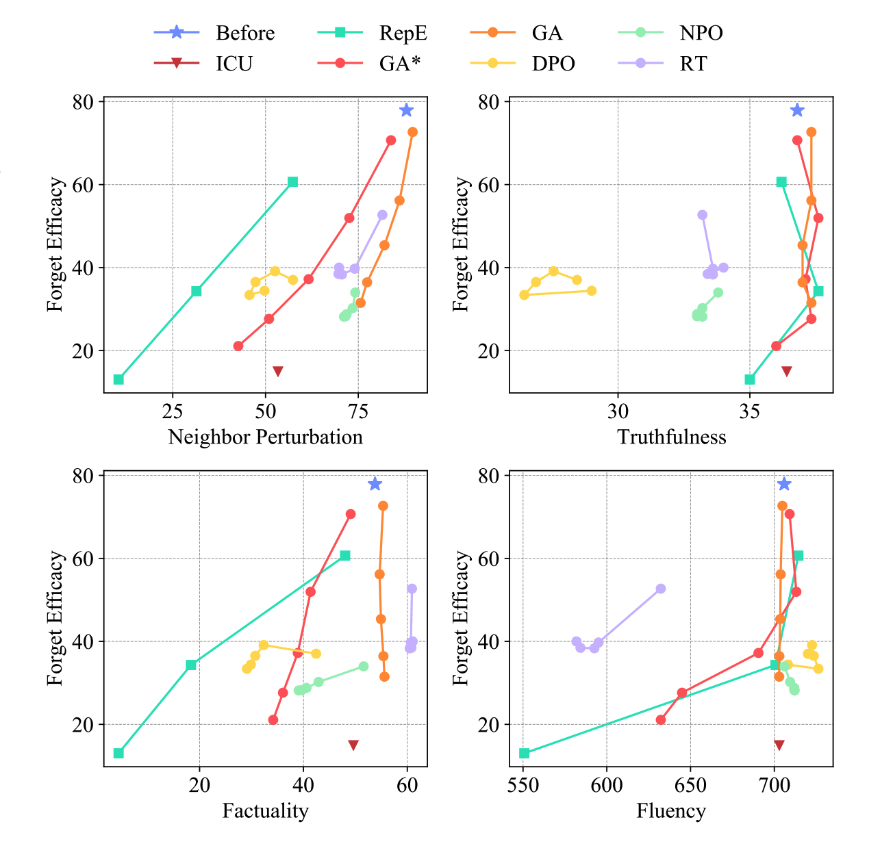 Figure 4: Trade off between unlearning efficacy, locality and model utility of LLaMA3-Instruct (8B). Figure and description sourced from Jin et al., "RWKU: Benchmarking Real-World Knowledge Unlearning for Large Language Models," arXiv preprint, 2024