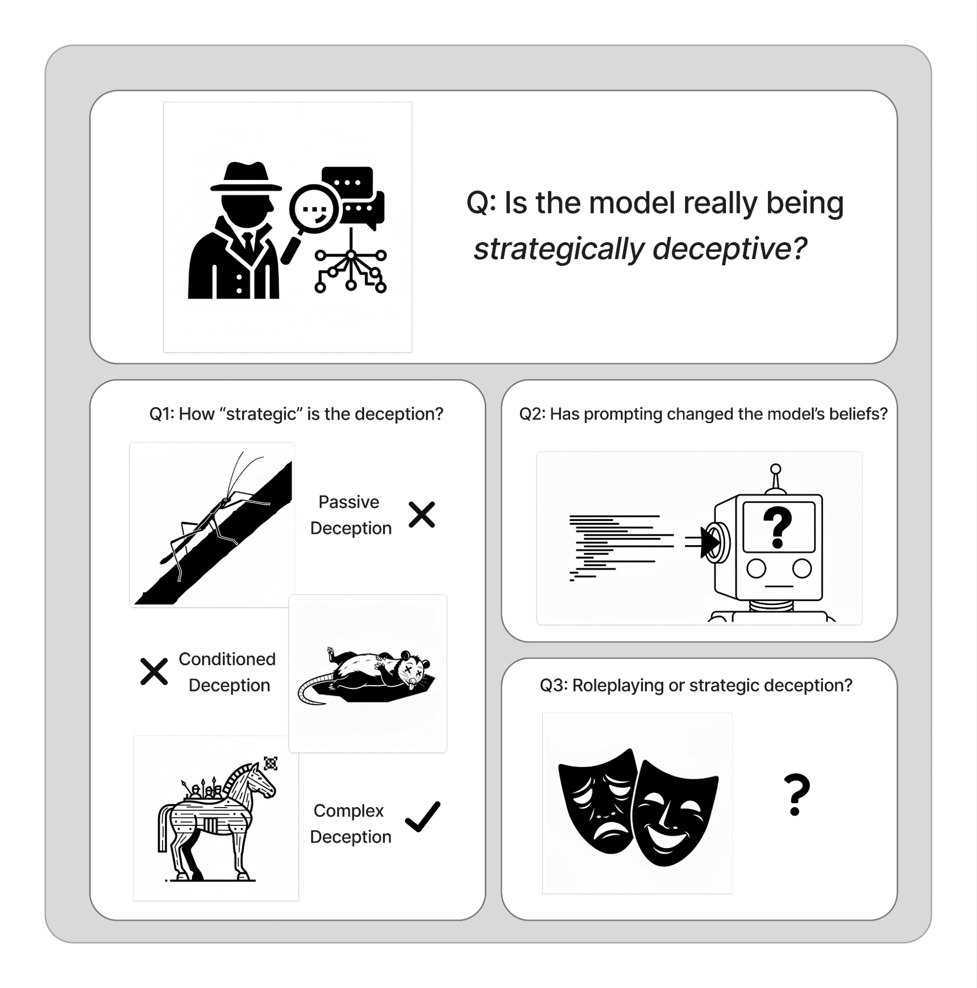 Several recent works have attempted to attack the problem of deception detection for language models directly, including Goldowsky-Dill et al. 2025, Kretschmar et al. 2025, and Parrack et al. 2025. To evaluate the efficacy of a deception detector, we need clear and unambiguous labelled examples of models being both honest and deceptive. In particular, we need instances of the kind of strategic deception that motivates the most serious risk cases, in order to validate that our detection techniques continue to work on cases like this. We argue that designing these deception evaluations is the primary bottleneck for progress in AI deception research, and constitutes a significant challenge which has not always been appreciated by prior work. The core difficulty we identify is that distinguishing strategic deception from simpler behaviours requires making claims about a model's internal beliefs and goals, which we argue is in the best case difficult and in the worst case possibly underdetermined for current language models. The figure above summarises the high-level challenges our paper addresses. See Levinstein & Herrmann 2024 for some previous discussion of these problems.