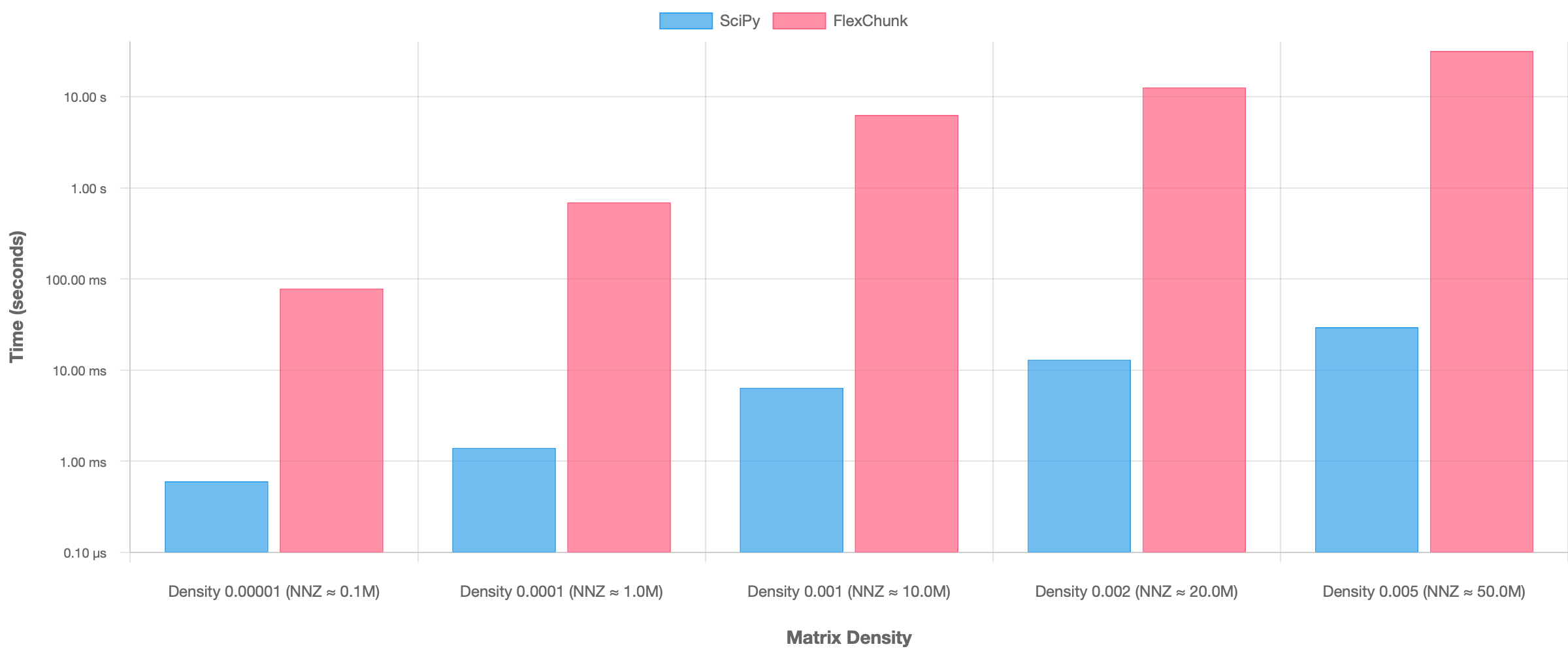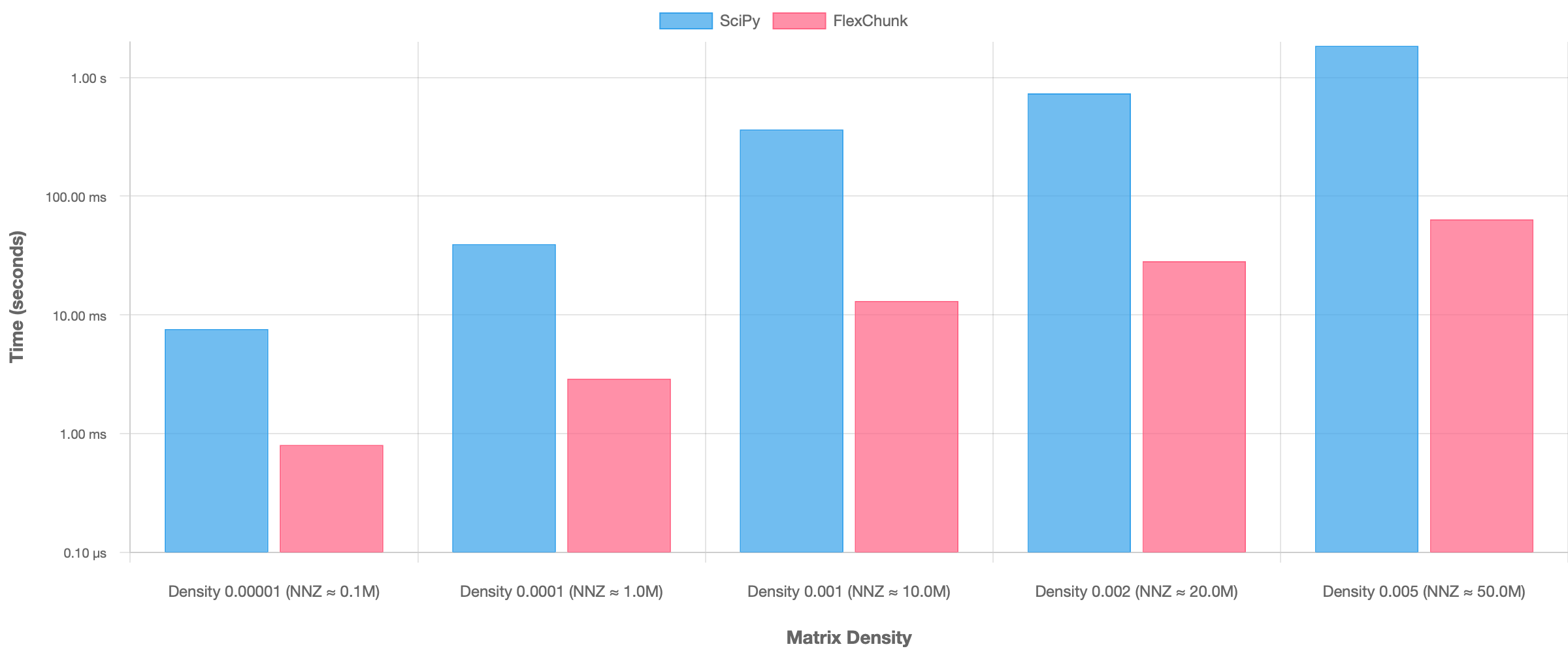 multiplication), outperforming FlexChunk by orders of magnitude, especially as density increased (Figure 6).This comparison underscores the core trade-off: FlexChunk is optimized for minimizing I/O and operating within limited memory, potentially at the cost of slower computation due to chunk management overhead. Conversely, SciPy is optimized for maximum in-memory computational speed but requires loading the entire matrix, making it susceptible to disk I/O bottlenecks during loading and fundamentally limited by available RAM.