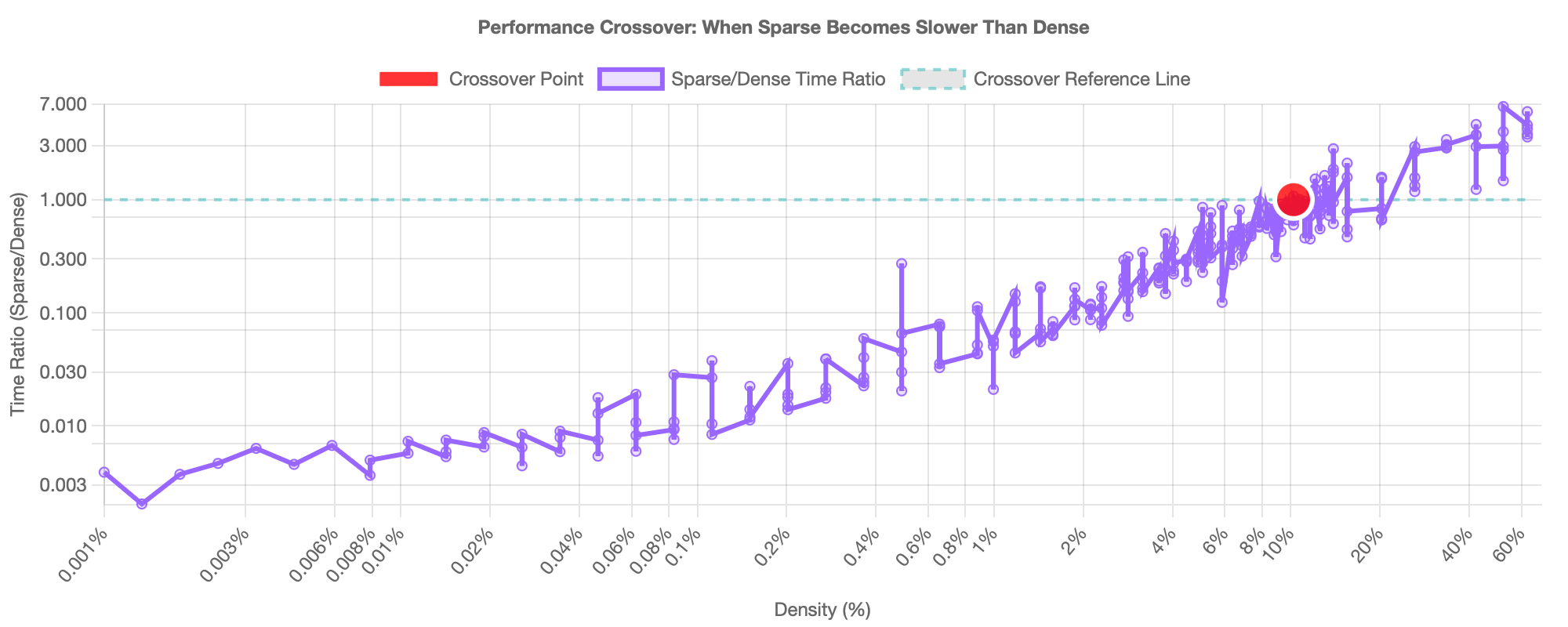 ), meaning performance gains from sparsity diminish relative to the reduction in non-zero elements. We also identified a crossover point around 10.23% density, above which using a dense NumPy approach becomes faster than SciPy's sparse method for this matrix size. This baseline confirms that sparsity alone doesn't guarantee efficiency and highlights the need for specialized approaches like FlexChunk for very large and sparse problems.