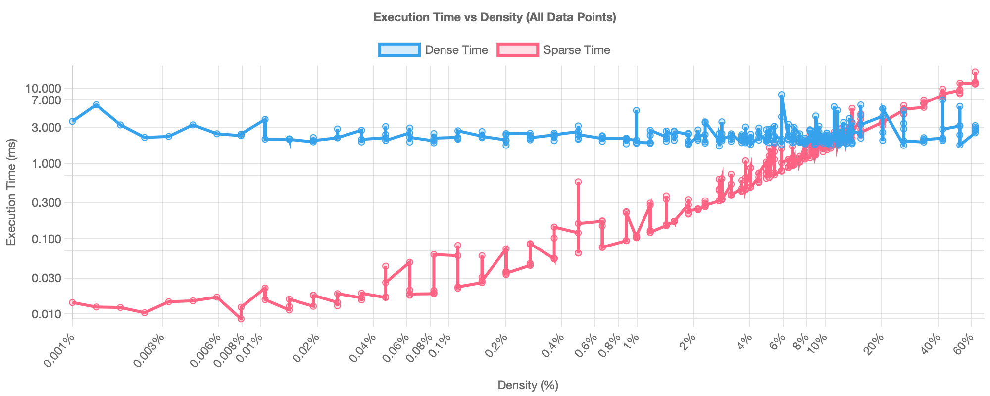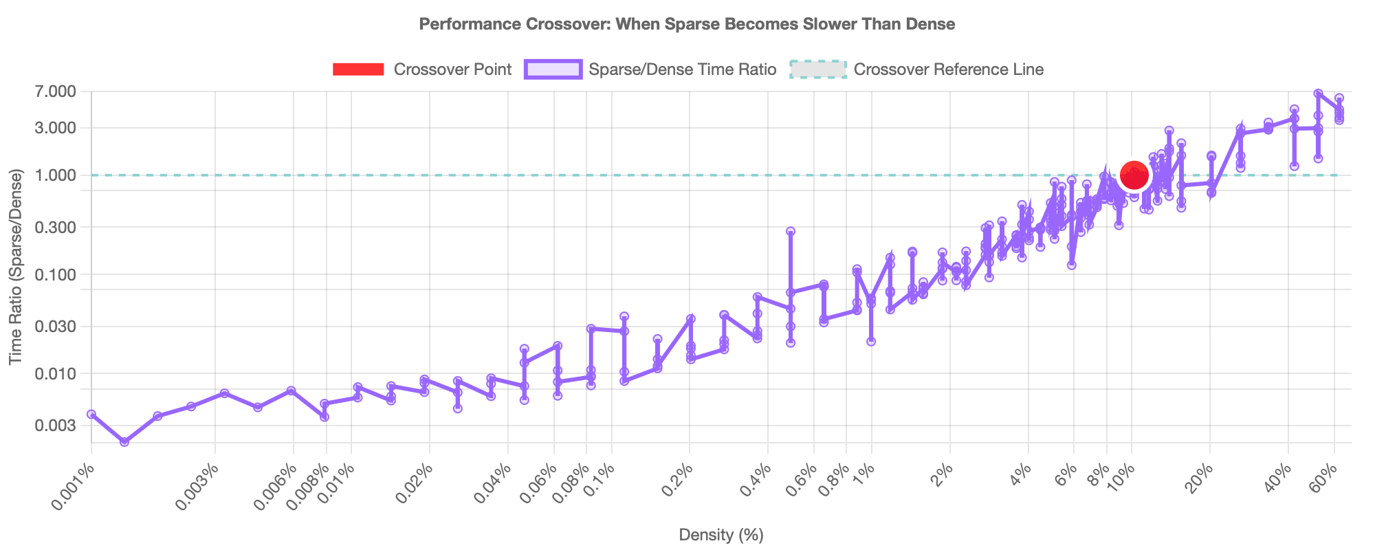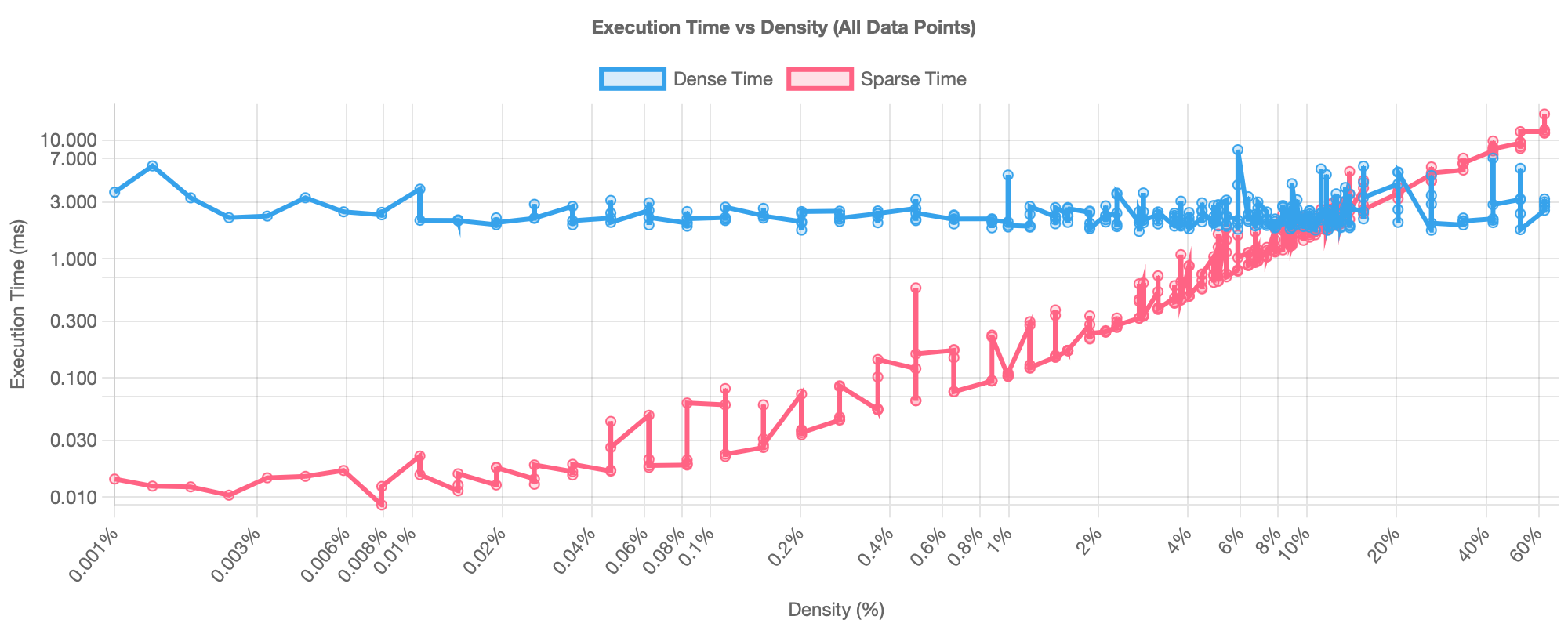 A direct comparison on a 100K×100K matrix across varying densities highlighted distinct performance characteristics: