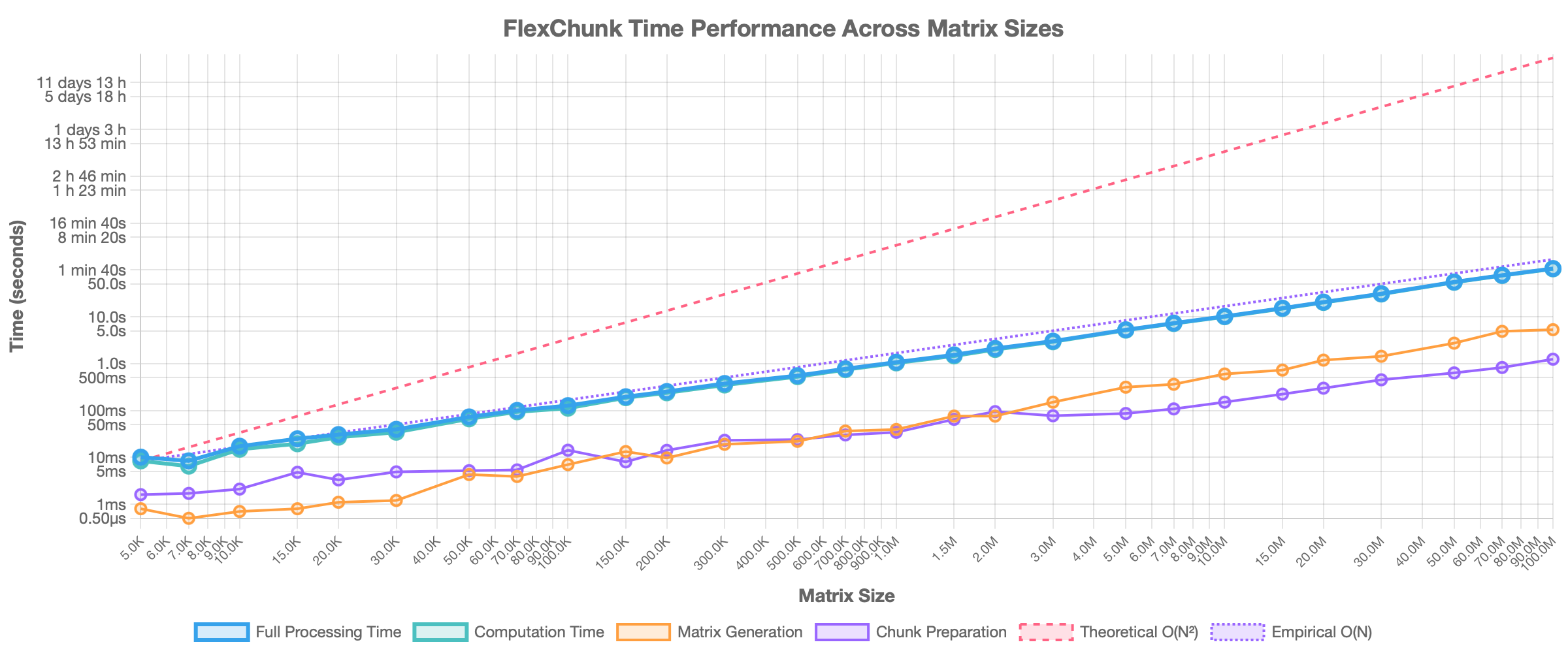 What's particularly noteworthy is that FlexChunk emerged precisely because we were willing to look beyond classical theoretical constraints when they contradicted empirical evidence. While theoretical analysis suggests that SpMV operations should scale as O(N²) for a matrix of dimension N×N, our empirical results consistently demonstrate near-linear O(N) scaling. Similarly, our density analysis revealed a sublinear power-law relationship (time ∝ density^0.63