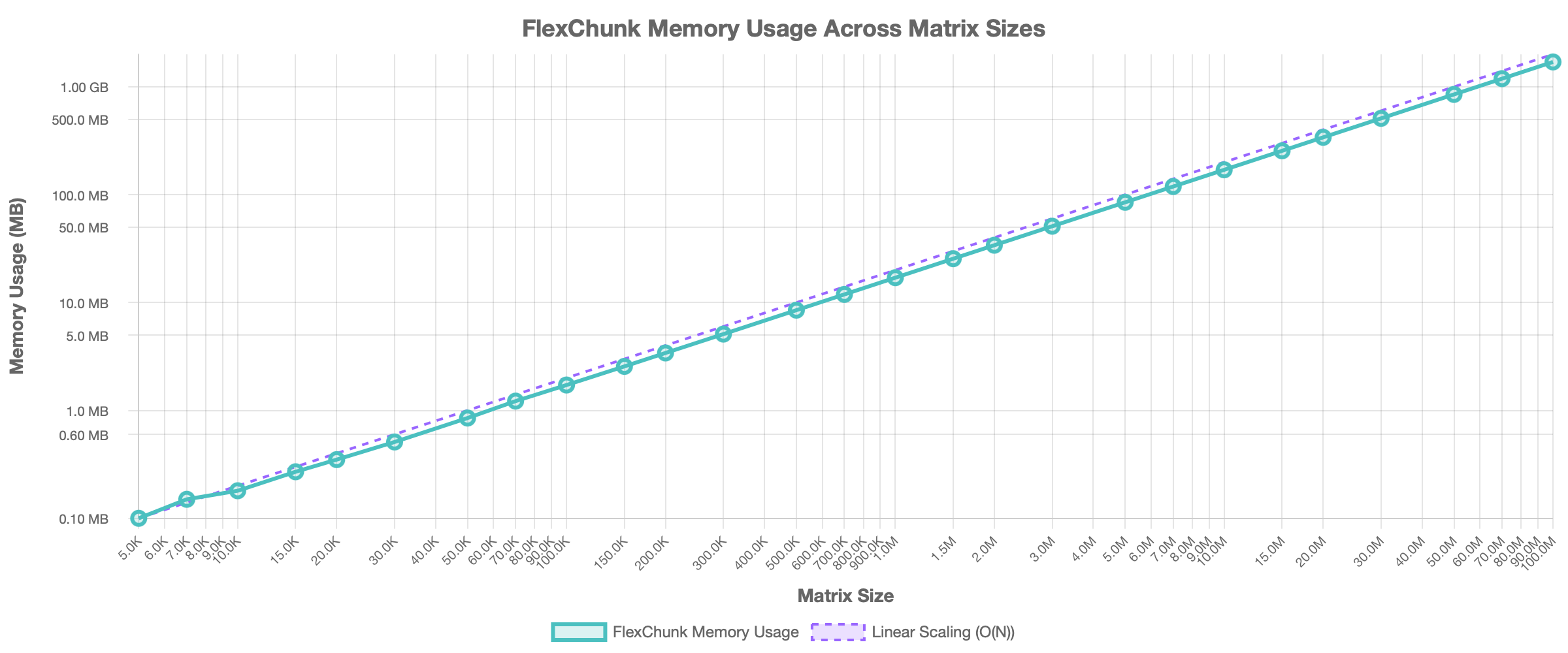 These results demonstrate FlexChunk's capability to handle extremely large matrices that would be infeasible for standard in-memory methods.