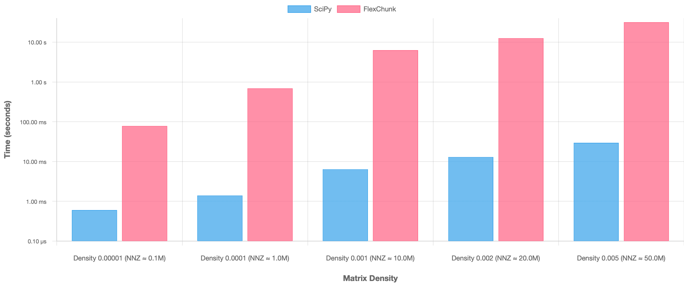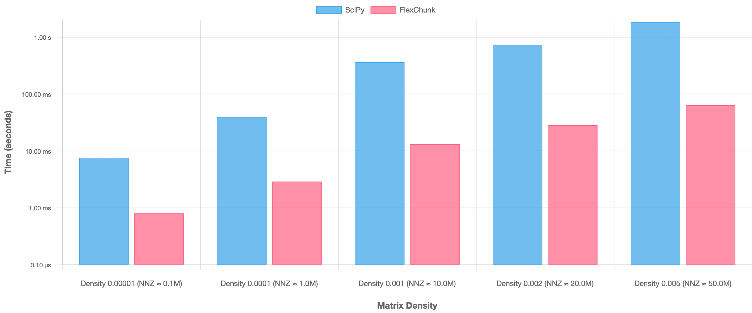 Computation Time: SciPy demonstrated substantially faster computation speeds (pure A @ x multiplication), outperforming FlexChunk by orders of magnitude, especially as density increased (Figure 6).